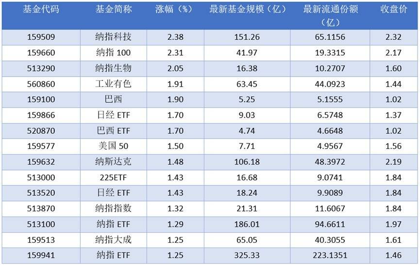根据巨灵财经统计的数据显示,2025年12月03日场内ETF基金中纳指科技(159509)领涨,涨幅为2.38%,排名靠前的纳指100(159660)、纳指生物(513290)、工业有色(560860),涨幅分别为2.31%、2.05%、1.91%。