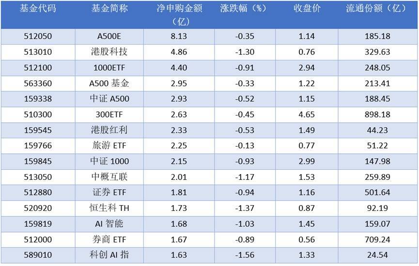 细分到资金流动情况上来看,2025年12月03日净申购金额最大的为A500ETF(512050),当日净申购金额为8.13亿元。排名靠前的港股科技(513010)、1000ETF (512100)、A500基金(563360),申购金额为4.86亿元、4.40亿元、2.95亿元。