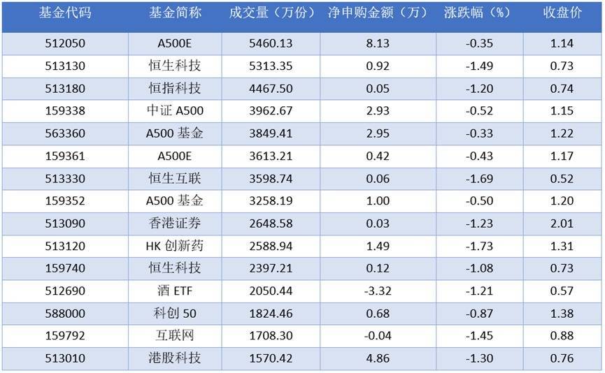 从成交量上来看,2025年12月03日成交量最大的是A500E TF (512050),成交量为5460.13万份。排名靠前的恒生科技(513130)、恒指科技(513180)、中证A500(159338),成交量分别为5313.35万份、4467.50万份、3962.67万份。