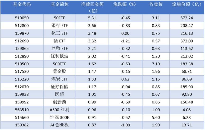 资金流出方面,2025年12月03日净赎回金额最多的是50ETF(510050),赎回金额5.31亿元。排名靠前的银行ETF(512800)、化工ETF(159870)、酒ETF(512690),赎回金额分别为3.66亿元、3.48亿元、3.32亿元。