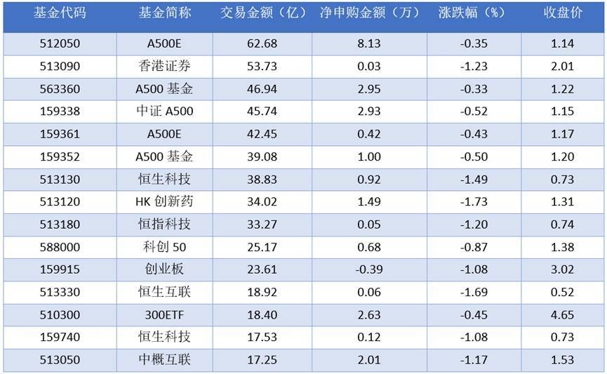 从成交金额上来看,2025年12月03日成交额最大的是A500ETF(512050),交易金额62.68亿元。排名靠前的香港证券(513090)、A500基金(563360)、中证A500(159338),成交额分别为53.73亿元、46.94亿元、45.74亿元。