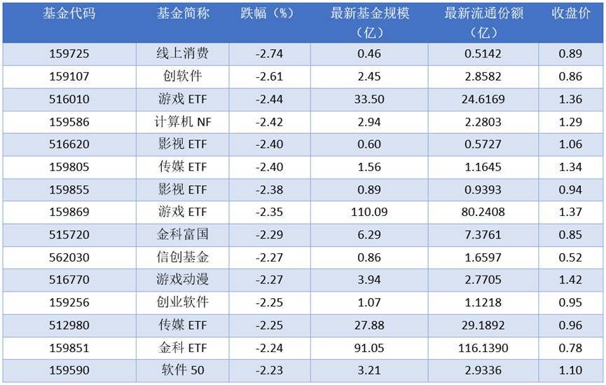 下跌方面,2025年12月03日跌幅最大的是线上消费(159725),跌幅达到2.74%。排名靠前的创软件(159107)、游戏ETF (516010)、计算机NF(159586),跌幅分别为2.61%、2.44%、2.42%。