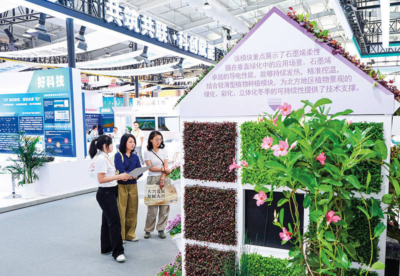 在北京举办的 2025 年中国国际服务贸易交易会上,参展商向参观者介绍建筑垂直绿化的应用(2025 年 9 月 12 日摄) 陈晔华摄 / 本刊筑牢统计核算根基 强化双碳数据支撑