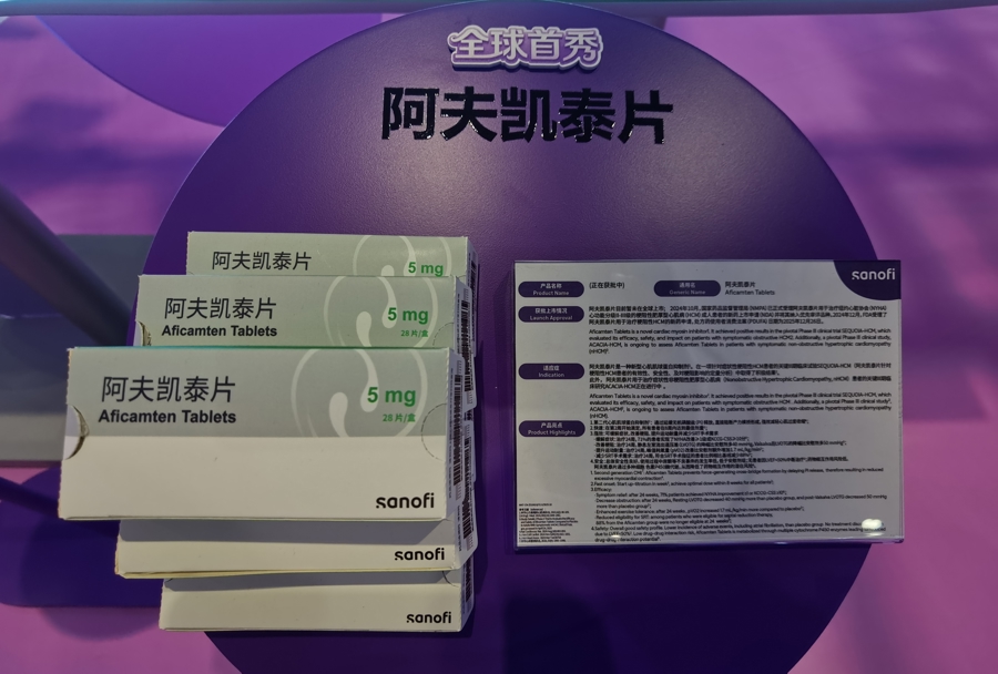 赛诺菲展台上,两款全球首秀的重磅创新药已展露真容,它们是心血管领域的阿夫凯泰片和普乐司兰钠注射液。肥厚型心肌病作为遗传性心脏疾病,可能引发猝死、心力衰竭、血栓栓塞等致命风险,传统药物治疗仅能部分缓解症状,侵入式治疗普遍存在手术并发症。阿夫凯泰片作为第二代心肌肌球蛋白抑制剂,能够避免患者陷入“两难”困境,是目前最有吸引力的疗法之一。