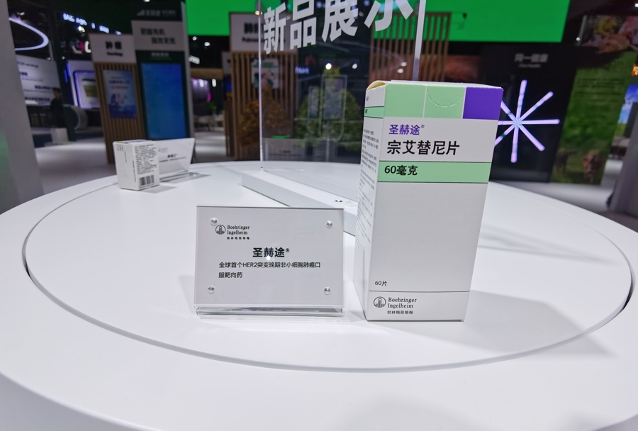 勃林格殷格翰一口气展出3款获得“突破性疗法认定”的创新药。其中,圣赫途(宗艾替尼片)是一款肺癌领域的创新药,是全球首个且目前唯一获批的口服HER2酪氨酸激酶抑制剂,用于治疗存在HER2(ERBB2)激活突变且既往接受过至少一种系统治疗的不可切除的局部晚期或转移性非小细胞肺癌。