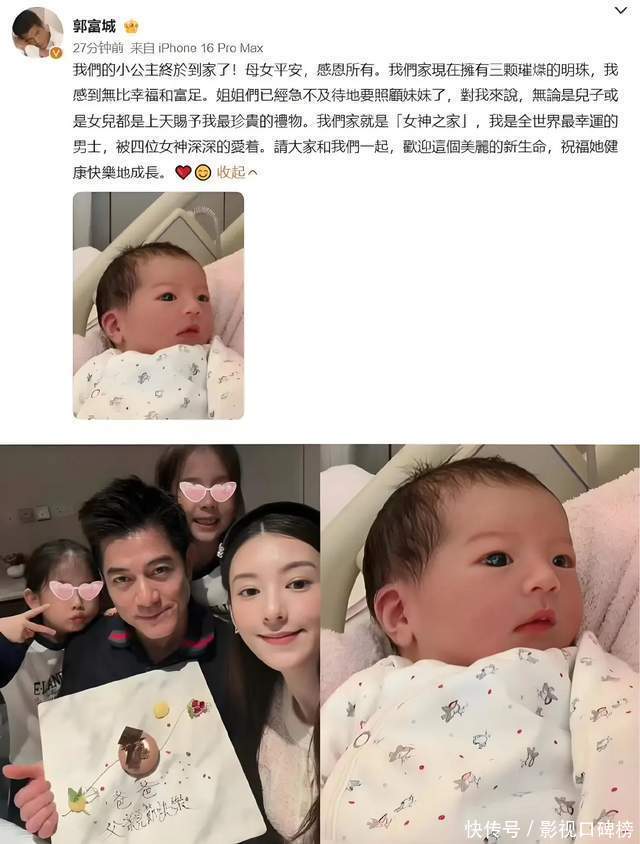 在小婴儿握住他手指的瞬间,郭富城觉得胸腔里被幸福填满,那份满足能够融化所有疲惫。亲子互动细节显示 ,姐姐们很爱妹妹,整个家庭氛围异常和睦。或许对于超级奶爸郭富城而言,当前重心是陪伴三个女儿长大,而非急于追生新生命。