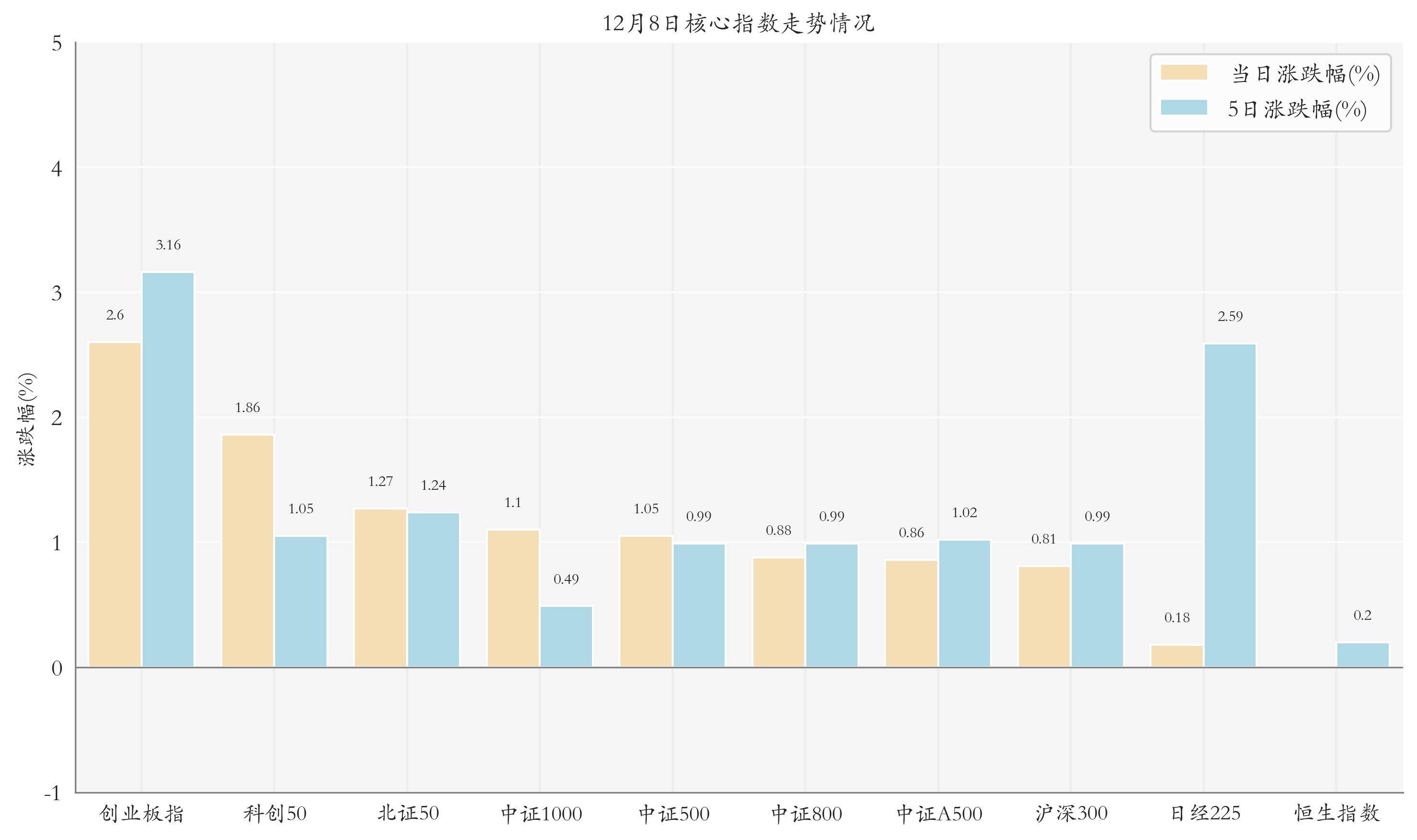 二、今日行情速览1.指数走势统计A股与海外主要核心指数走势,今日(12月8日,下同)三大指数集体上涨,其中上证指数上涨0.54%,收于3924.08点,日内最高3936.31点;深证成指上涨1.39%,收于13329.99点,日内最高13389.67点;创业板指上涨2.6%,收于3190.27点,日内最高3214.48点。今日创业板指、科创50与北证50走势排名靠前,日涨跌幅分别为2.6%、1.86%与1.27%;近5个交易日创业板指、日经225与北证50的走势排名靠前,近5日涨跌幅分别为3.16%、2.59%与1.24%。