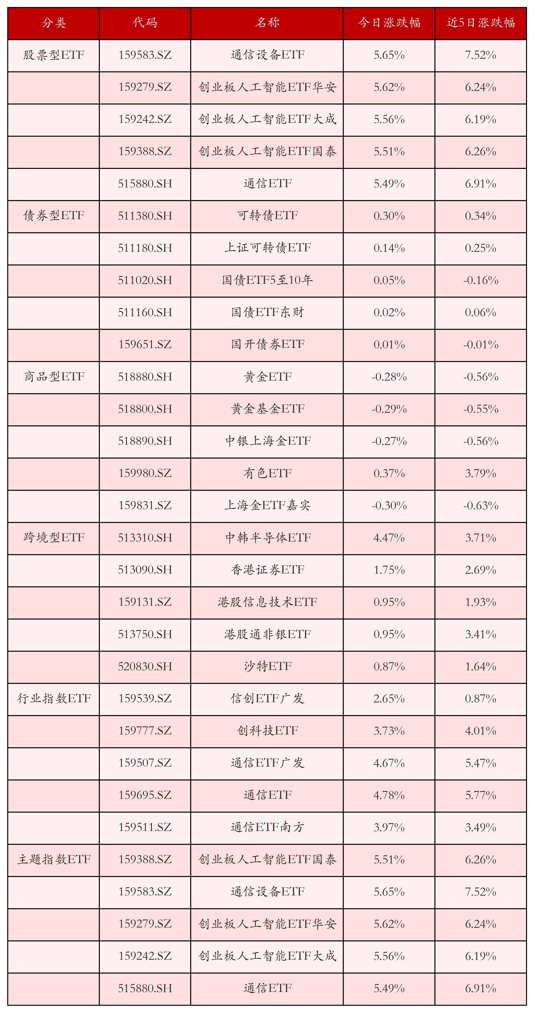 从不同投资种类、行业、主题的ETF产品中找出今日走势行情排名前5的ETF基金,今日涨幅靠前的ETF产品如下表所示。股票型ETF中涨跌幅排名前3位的ETF产品分别为通信设备ETF(159583.SZ)、创业板人工智能ETF华安(159279.SZ)和创业板人工智能ETF大成(159242.SZ),今日收益率分别为5.65%、5.62%和5.56%。