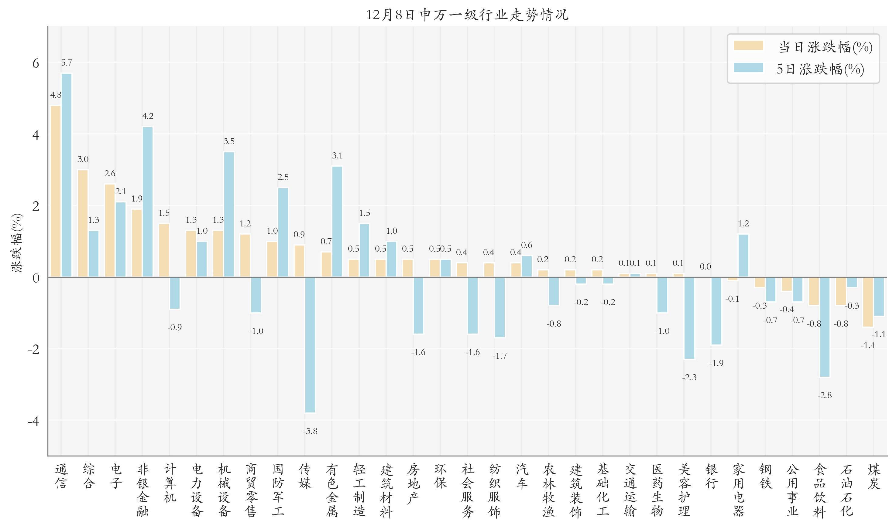 统计今日全部申万一级行业涨跌幅情况,通信、综合与电子今日走势排名靠前,日涨跌幅分别为4.79%、3.03%与2.6%,煤炭、石油石化与食品饮料的走势排名靠后,日涨跌幅分别是-1.43%、-0.84%与-0.78%;近5个交易日通信、非银金融与机械设备的走势排名靠前,近5日涨跌幅分别为5.69%、4.18%与3.46%,传媒、食品饮料与美容护理的走势排名靠后,近5日涨跌幅分别为-3.82%、-2.83%与-2.31%。
