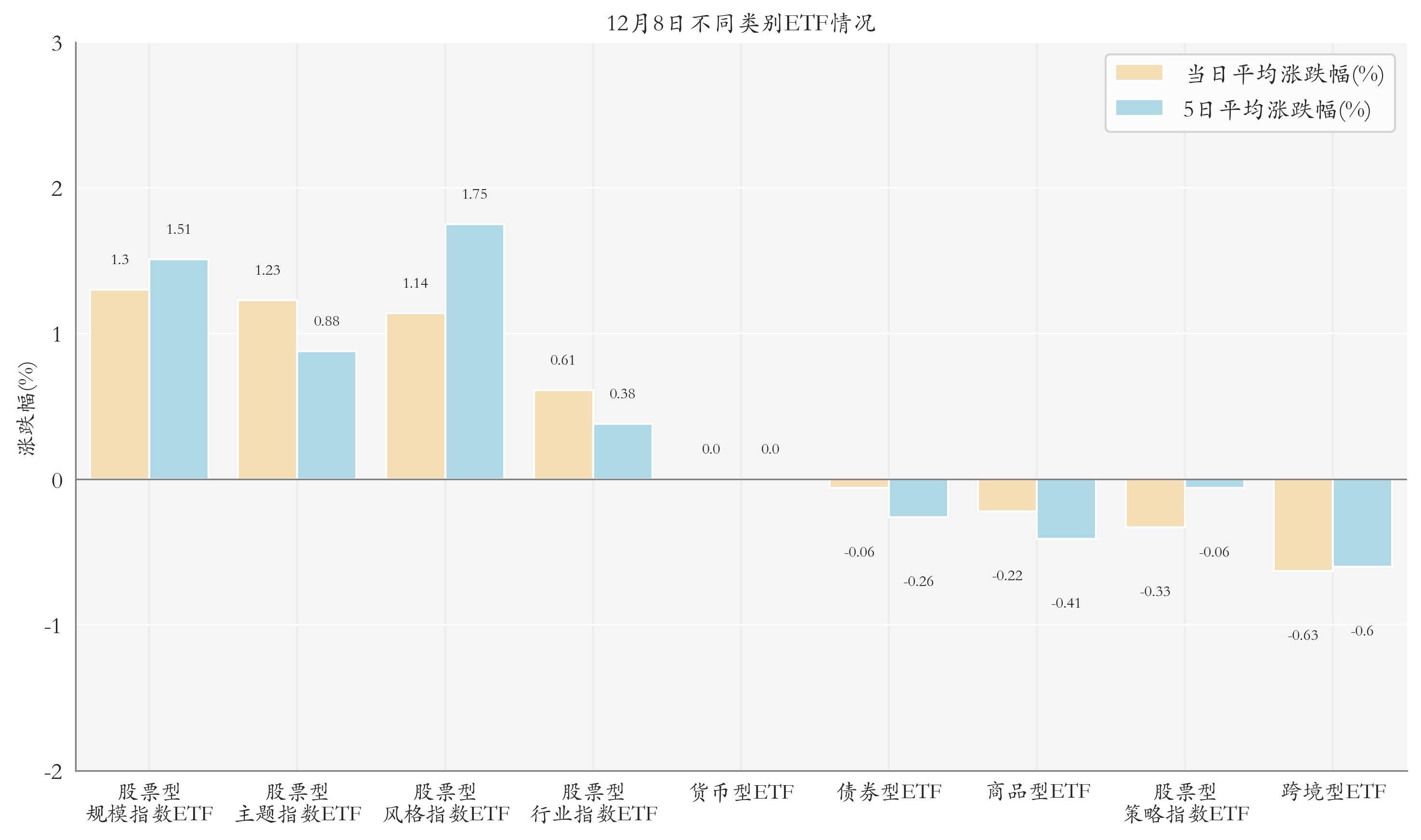 根据ETF基金的投资范围,将ETF基金划分为股票型规模指数ETF、股票型行业指数ETF、股票型策略指数ETF、股票型风格指数ETF、股票型主题指数ETF、债券型ETF、商品型ETF、货币型ETF、跨境ETF,今日股票型规模指数ETF表现最优,该类ETF的平均涨跌幅为1.30%;跨境型ETF的表现最差,该类ETF的平均涨跌幅为-0.63%。